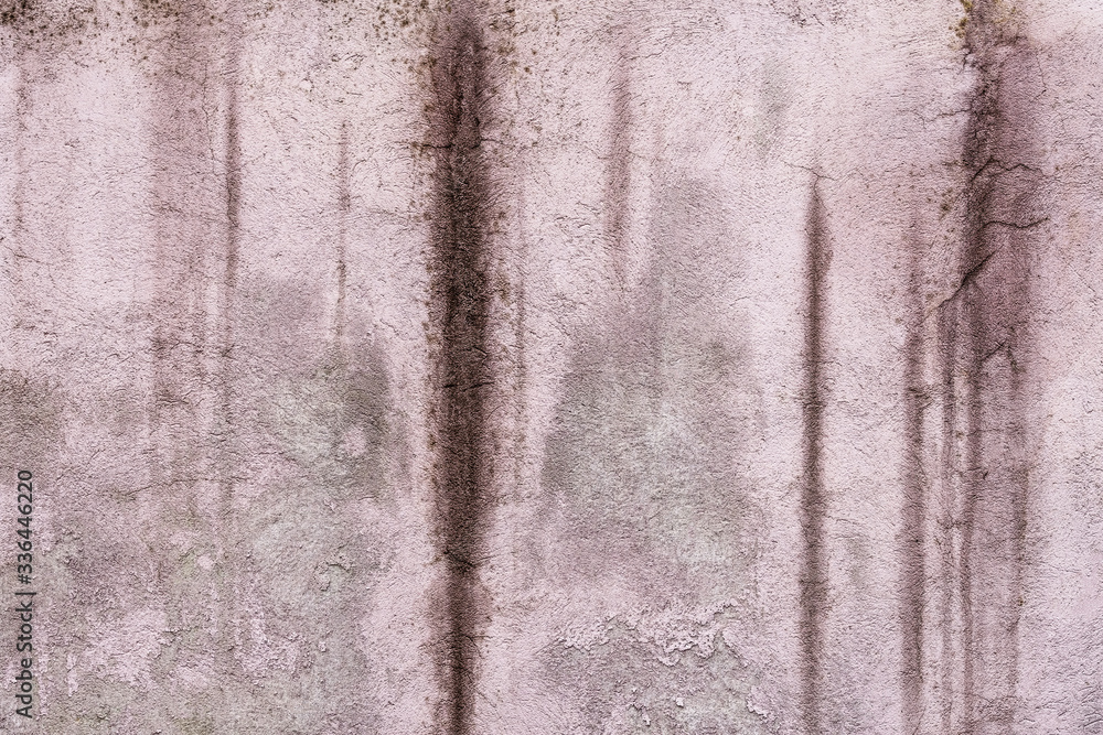 Abstract grunge texture of old purple wall with peeled off paint. Creative background. Pink, grey and purple beautiful rough weathered stone texture. Copy space