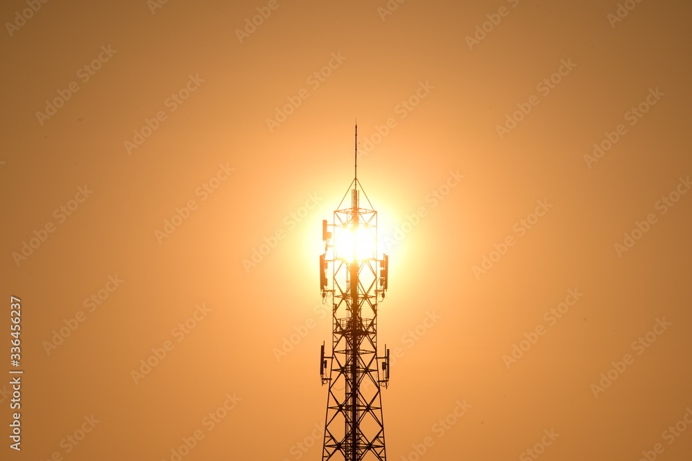 Wireless Communication Antenna With bright yellow sky in the morning sunrise .Telecommunication tower with antennas.High pole for signal transmission