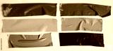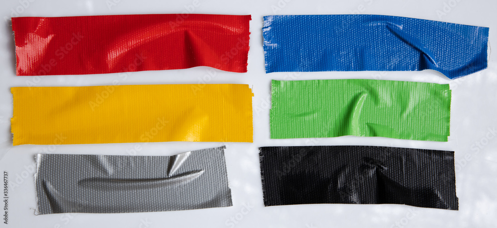 Set of red, gray, blue, yellow, green tapes on white background. Torn horizontal and different size sticky tape, adhesive pieces.