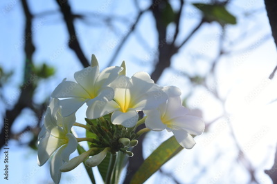 Colorful white flowers in the garden. Plumeria flower blooming.