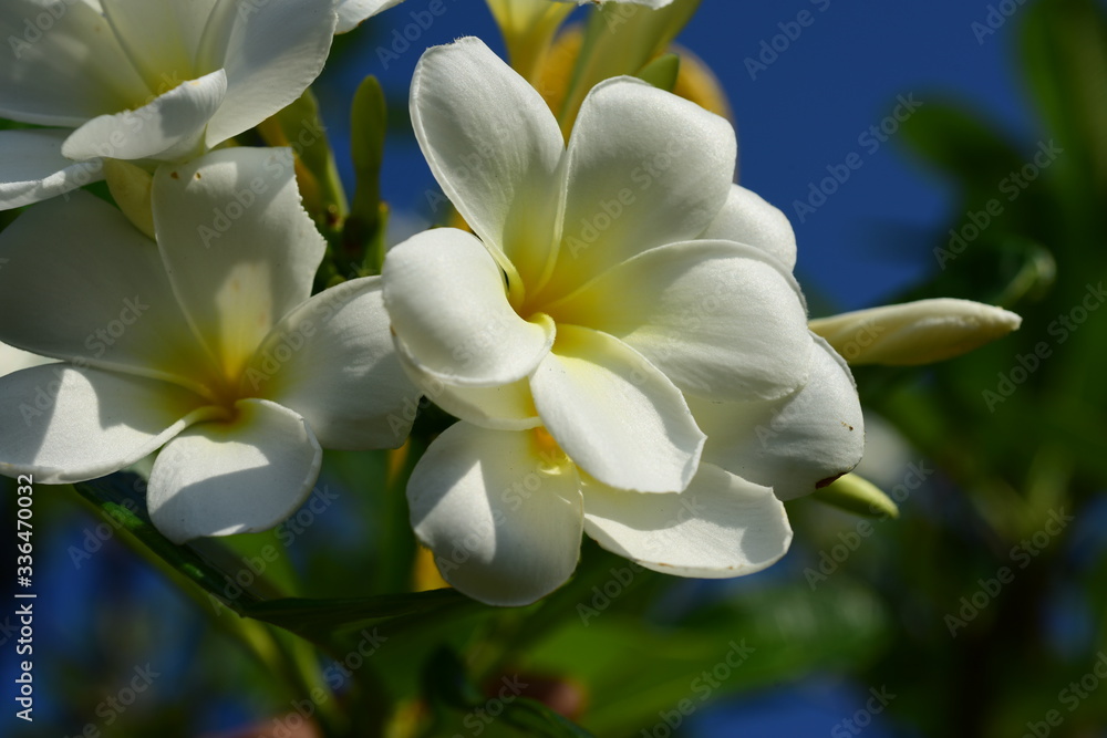 Colorful white flowers in the garden. Plumeria flower blooming.