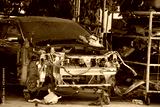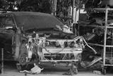 The car was damaged by a collision in an accident. Waiting for repairs at the garage