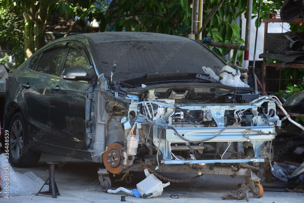 The car was damaged by a collision in an accident. Waiting for repairs at the garage