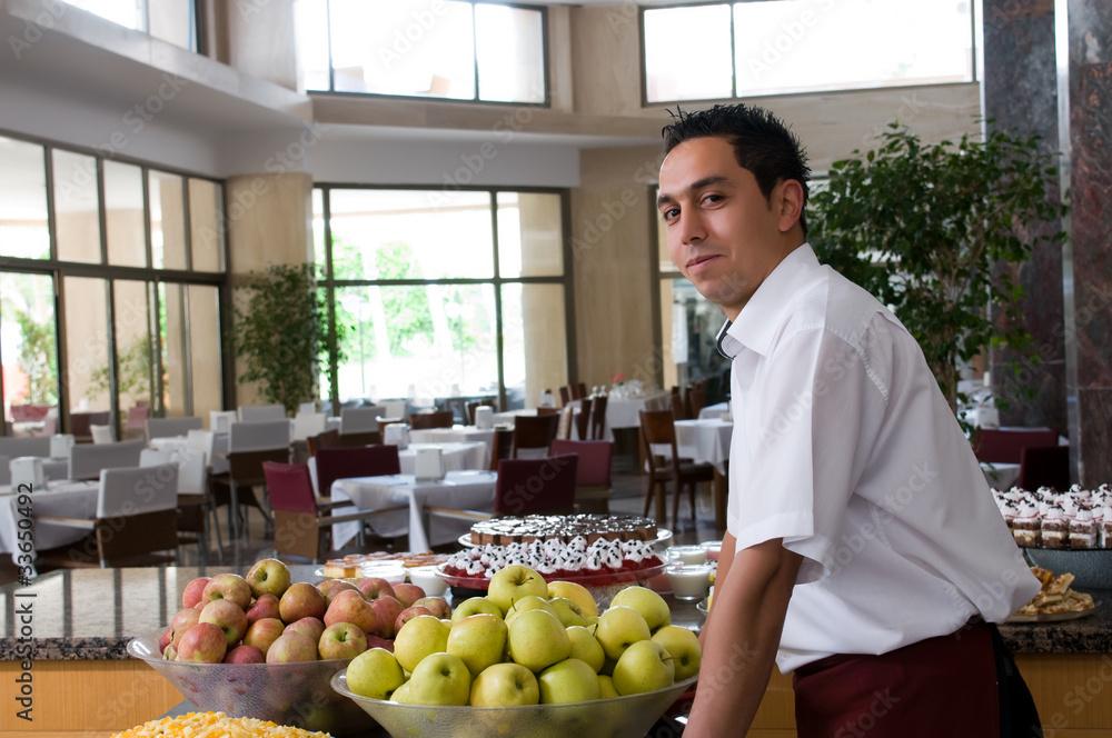 Waiter serving fresh fruits looking at camera.