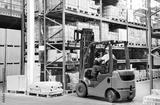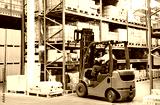 worker driver at warehouse forklift loader works