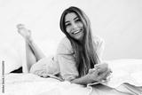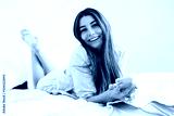 Young smiling woman lying in white bed and using a phone in her bedroom. Happy morning.