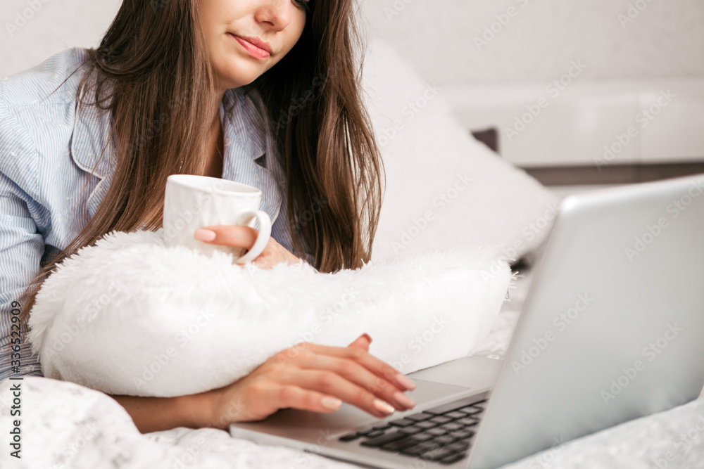 Young smiling woman working on laptop in her bedroom. Happy morning.