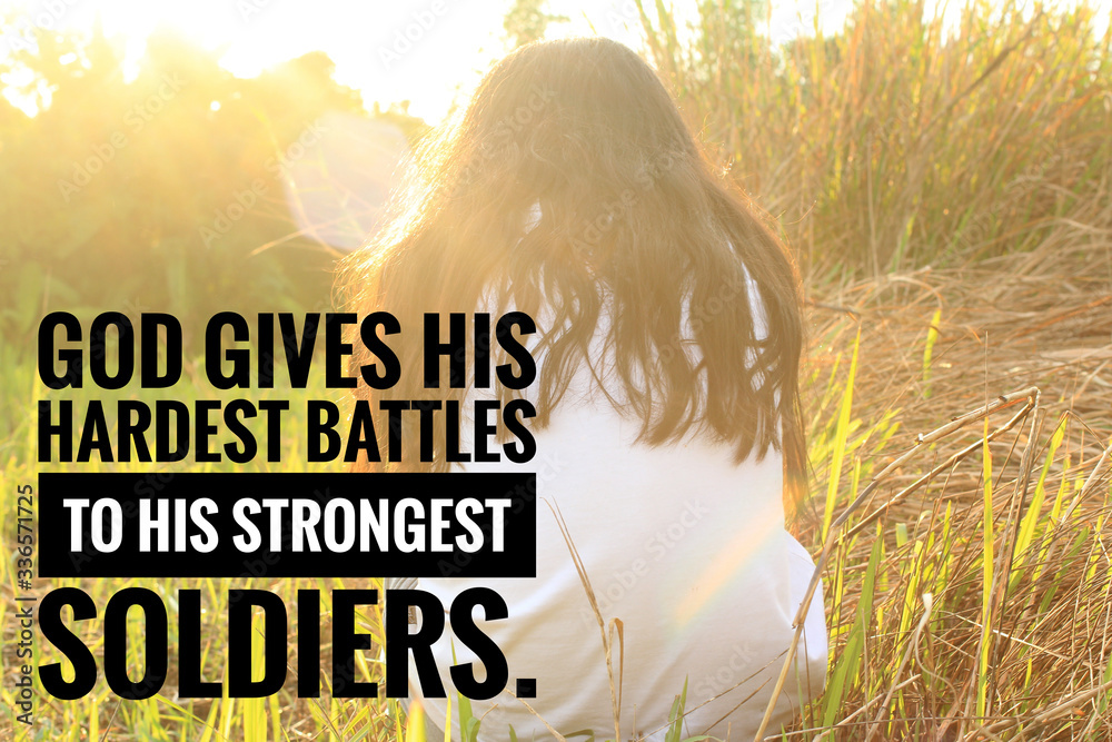 Inspirational quote - God gives his hardest battles to His strongest soldiers. With back of young girl sitting alone in a field at sunset sunrise background.