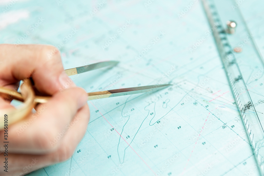 Measuring distance on a sea chart tool. Close-up. Navigation in the maritime industry and yachting.