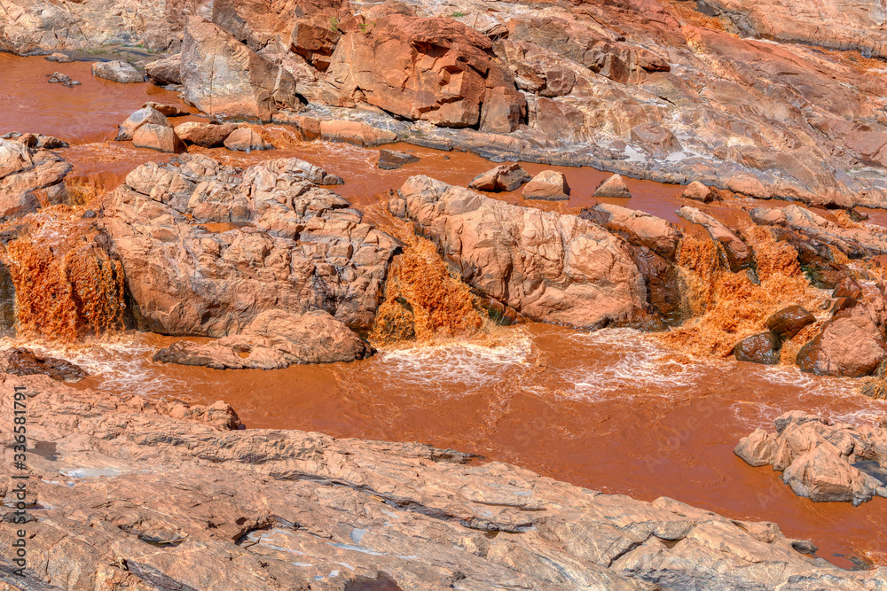 Rocky river bed Betsiboka river after heavy rain, fast red yellow water stream, northern Madagascar landscape