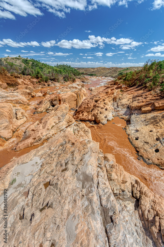 rocky river bed Betsiboka river after heavy rain, red yellow water stream, landscape with blue sky, northern Madagascar landscape, Africa wilderness