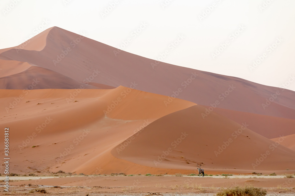 beautiful landscape hidden Dead Vlei in Namib desert, with oryx antelope, Namibia, Africa wildlife and wilderness