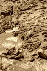 Rocky river bed Betsiboka river after heavy rain, red yellow water stream, northern Madagascar landscape