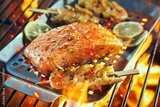 Raw salmon fillet with prawn kebabs on a fire