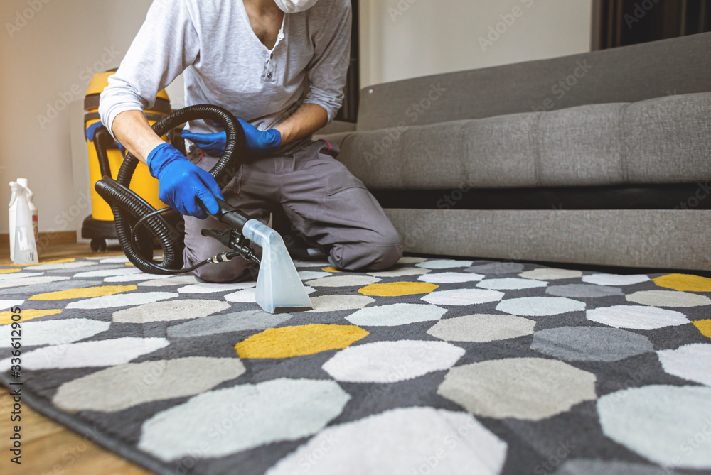 Dry cleaner's man employee removing dirt from carpet, vacuum clean with professional equipment.