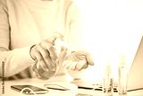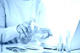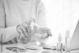 Business woman using wash hand sanitizer gel pump dispenser. Laptop mouse smartphone, medical face mask, and alcohol spray for prevention Coronavirus disease (COVID-19). Healthcare concept.