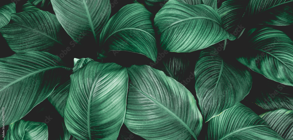 leaves of Spathiphyllum cannifolium, abstract green texture, nature background, tropical leaf
