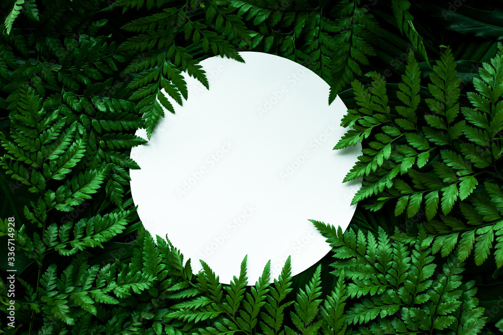 tropical green leaves and palms background with white paper card note, nature flat lay concept