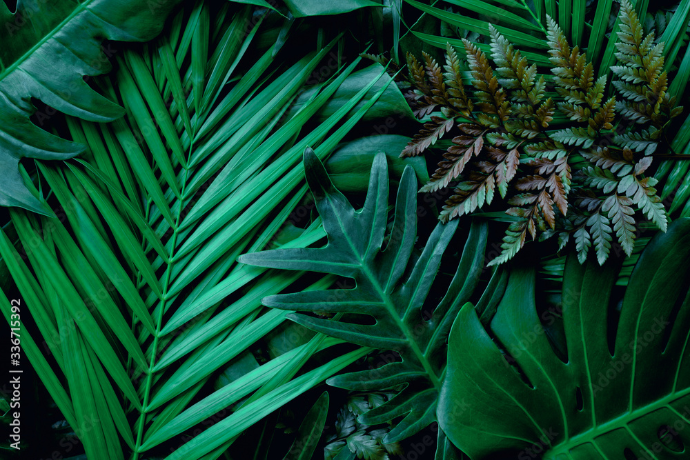 closeup nature view of green monstera leaf and palms background. Flat lay, dark nature concept, tropical leaf