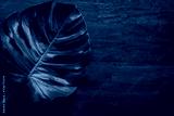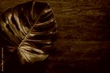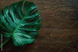 Monstera leaf top view philodendron leaf pattern on old wooden table background, copy space