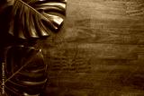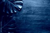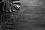 Monstera leaf top view philodendron leaf pattern on old wooden table background, copy space