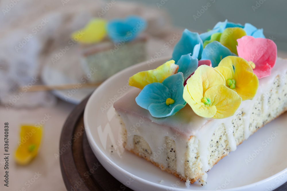 Lemon and poppy seeds loaf cake decorated with pastel fondant flowers