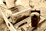 male bee-keeper with a smoke near an apiary or a beehive