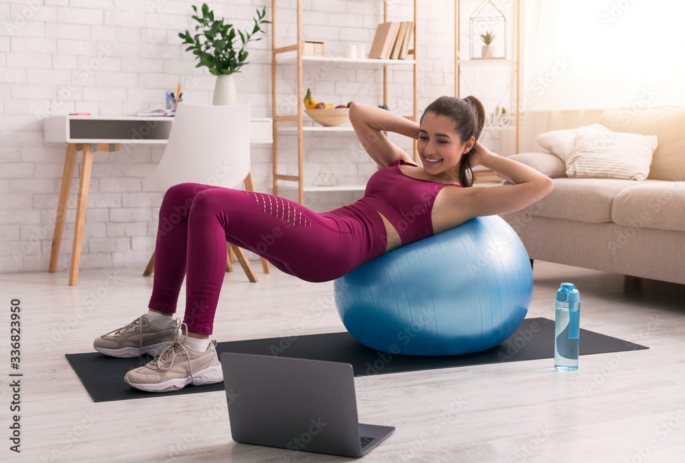 Stay home. Young girl doing exercises with fitness ball while watching online tutorials on laptop