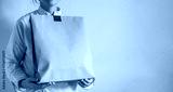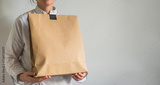 Chef making a delivery of food takeaway in a paper carton bag with copy space