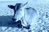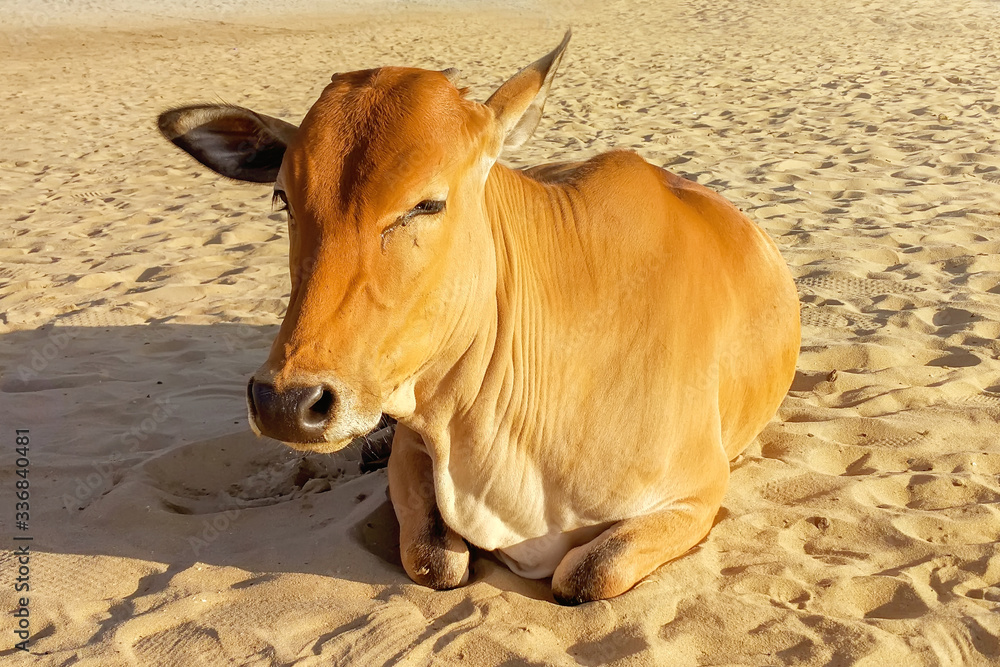 Yellow Indian cow lying on the sand of the beach, stray animal, sun glare.