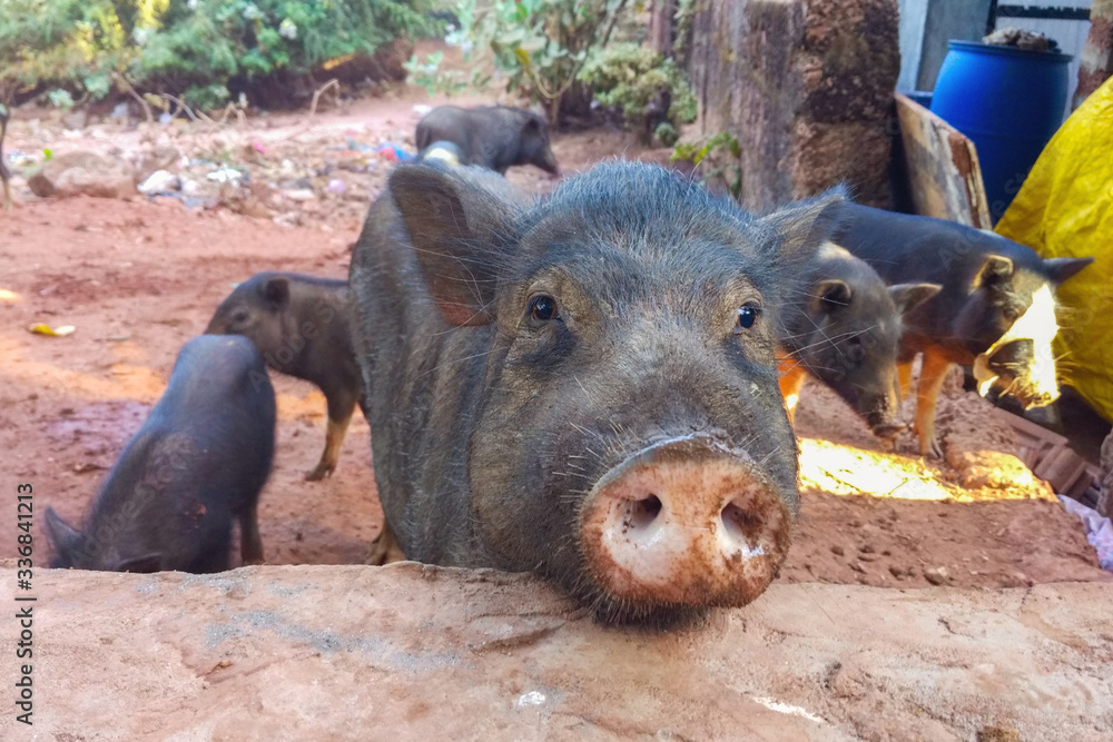 A herd of pigs in India in a makeshift pen, close-up of the face of a pig.