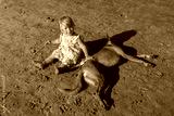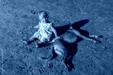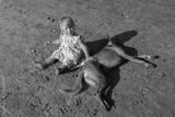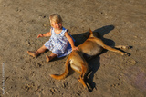 A little girl sits and strokes a red dog on the beach, the sun glints and color highlights.