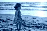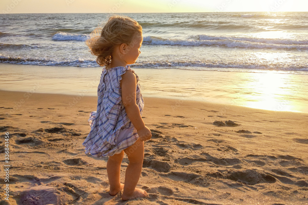 A little girl on a sandy beach against the background of the setting sun and sea waves looks into the distance, the General plan, sun glare and color lighting.