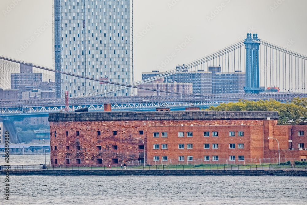 Governors Island during the gloomy weather from The Staten Island Ferry, New York.