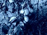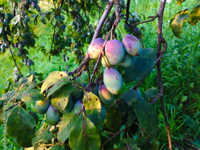The plum fruit on the branch with the leaves on the tree, just beginning to get blue.