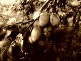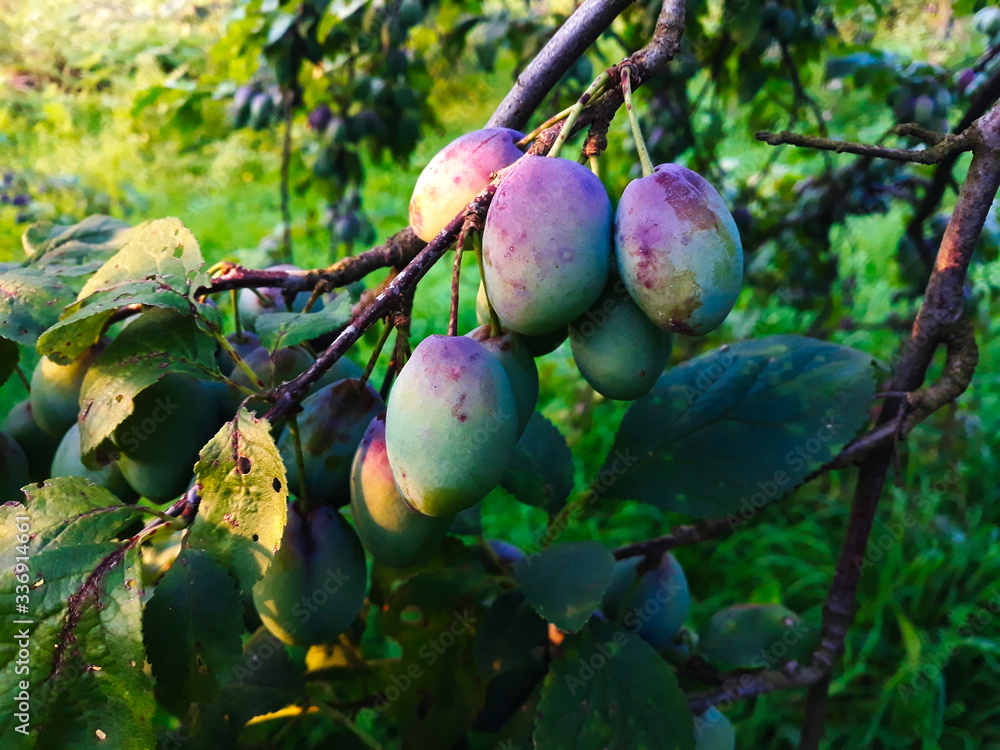 The plum fruit on the branch with the leaves on the tree, just beginning to get blue.