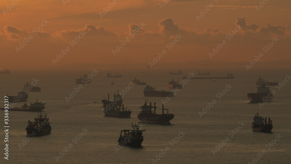 Silhouette image of large number of tankers and container ships at Singapore strait in the morning.