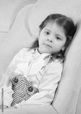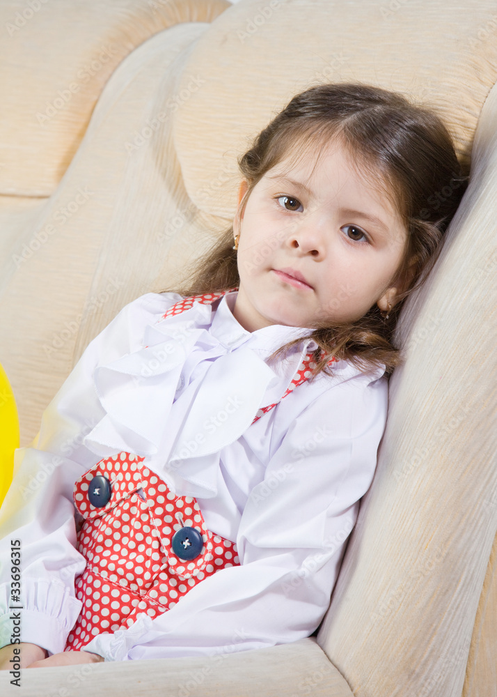 little girl sits in an armchair.