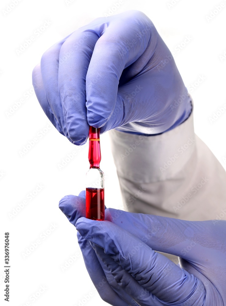 Medical worker's hands in protective gloves holding a ampoule, close-up.