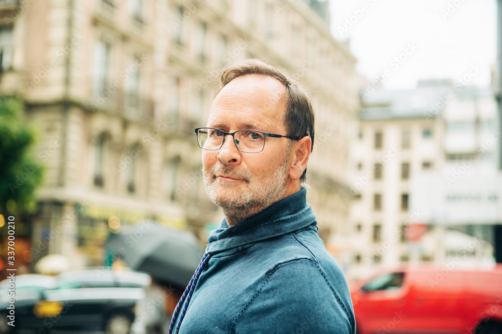 Outdoor portrait of middle age man on city street, wearing eyeglasses and blue sweatshirt
