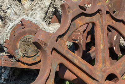 Close view background of rusted metal industrial parts set into crumbling concrete, horizontal aspect