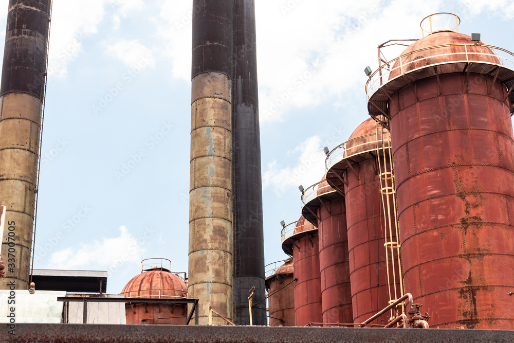 Sloss Furnaces National Historic Landmark, Birmingham Alabama USA, rows of blast furnaces and smoke stacks, horizontal aspect