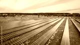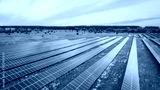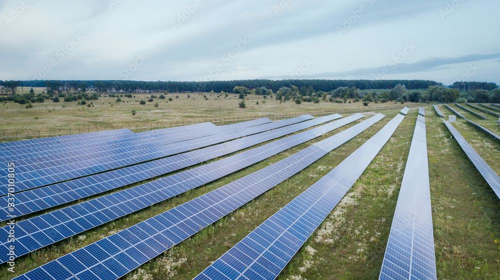 aerial view of solar panels on green lawn. drone shot, bird's eye
