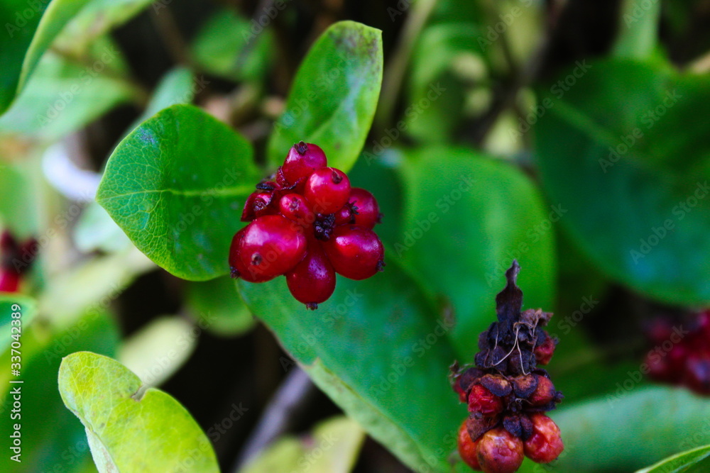 Honeysuckle plant. Berries of honeysuckle (Lonicera periclymenum)