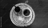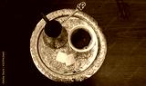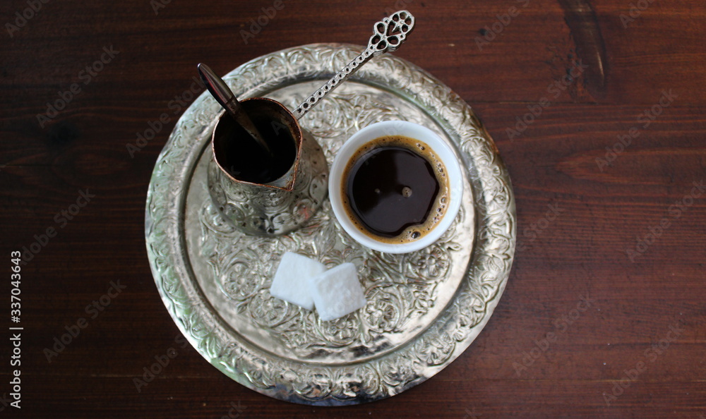 Bosnian coffee. A metallic tray with copper-plated cezve džezva filled with traditional foam Bosnian coffee, a clay cup, and sugar cubes served in an ornament Sarajevo set