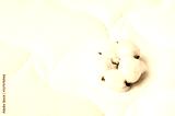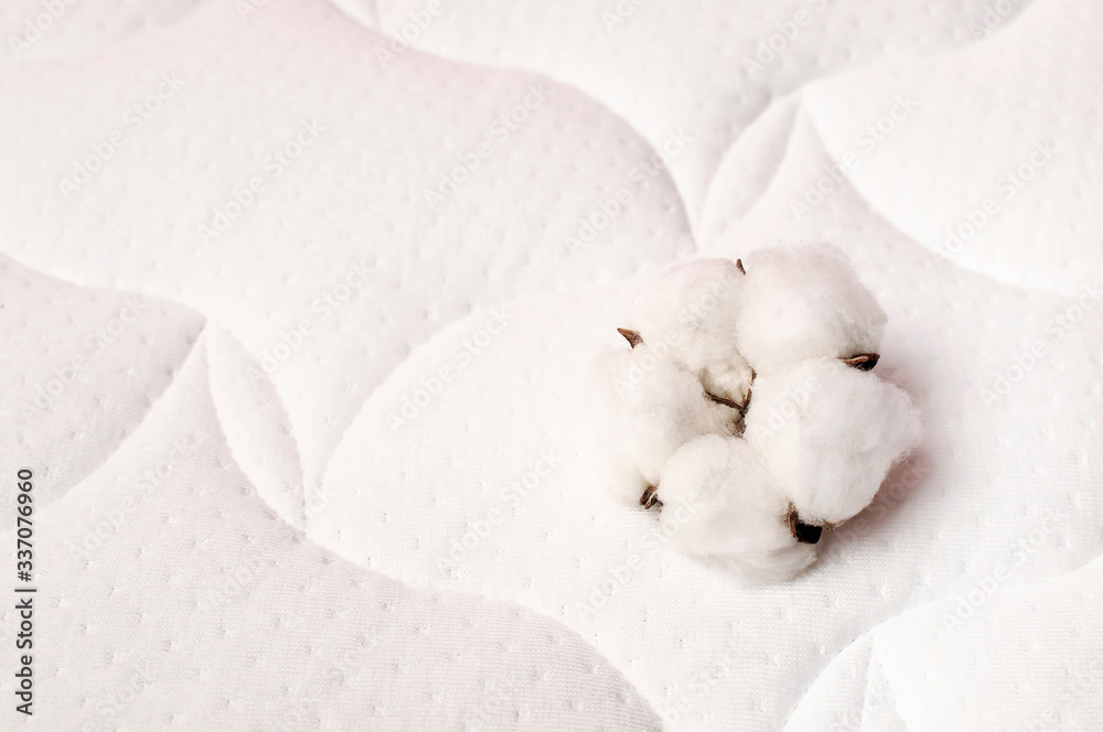 Cotton flowers on a comfortable mattress texture background top view. White texture of mattress bedding background. Healthy sleep concept, comfortable bed. Tender air background with cotton