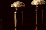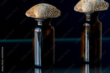 Two bottles of aromatic oils made of dark glass on a black background.The caps of the bottles are sea shells. selective focus.