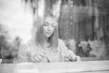 closeup portrait of woman eating green salad in restaurant