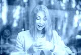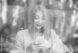 Portrait surprised smiling screaming woman using looking at phone coffee shop background. Happy surprise