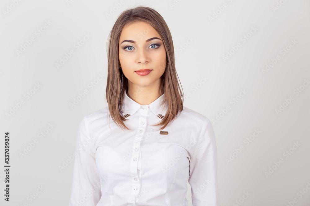 Portrait serious young business woman wearing white shirt, looking to you camera, isolated white background. One single person. Neutral human emotion facial expression feeling.
